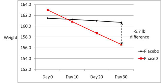 Figure 1: Subjects consumed a 2000-2200 calorie carbohydrate rich diet. The Phase 2 group experienced ~700% greater weight loss compared to the placebo.