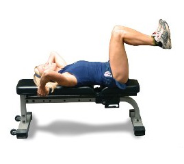 • Draw your abdominals in and slowly crunch your upper body to a position in which you can maintain neutral hip alignment.  Keep your chin tucked in to prevent a forward-head posture.  Hold the top position 2 seconds and slowly return to the starting position while maintaining the drawing-in maneuver.
